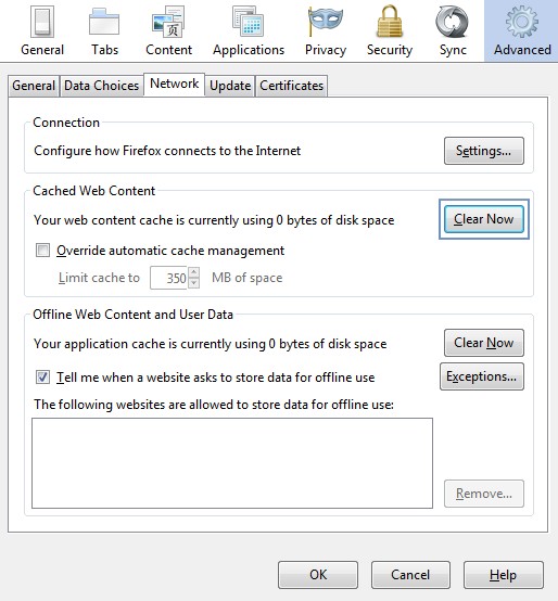 4. A new window opens up, go to the Advanced -> Network tab and make sure you select the options as shown on the image below and then click on "Clear Now" then click "OK".